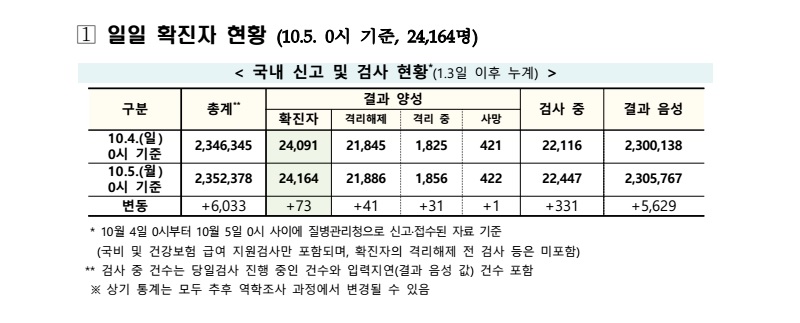보건·의료 | 코로나19 국내 확진환자 총 24164명 및 격리해제 21886명·사망 422명, 10월 5일 0시 기준 73명 추가 확인