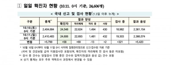 이에 따라 국내 코로나 19 확진자는 10월 11일(일) 0시 기준 24,606명으로 10월 10일(토) 0시 기준 24,548명에서 58명이 증가했으며 치료가 완료되어 검사 결과 음성으로