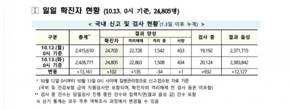 이에 따라 국내 코로나 19 확진자는 10월 13일(화) 0시 기준 24,805명으로 10월 12일(월) 0시 기준 24,703명에서 102명이 증가했으며 치료가 완료되어 검사 결과 음성으로 격리 해제된 자는 135명이 추가되며 총 22,863명, 사망은 10월 12일 대비 1명이 늘어나 434명, 나머지 1,508명은 격리 치료 중이다.
