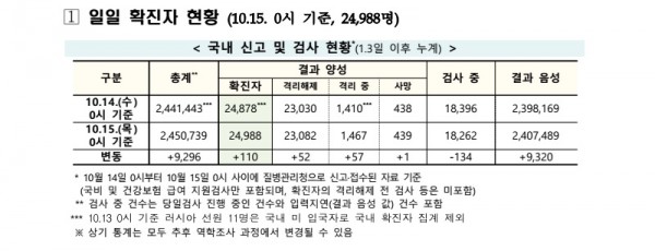 이에 따라 국내 코로나 19 확진자는 10월 15일(목) 0시 기준 24,988명으로 10월 14일(수) 0시 기준 24,878명에서 110명이 증가했으며 치료가 완료되어 검사 결과 음성으로 격리 해제된 자는 52명이 추가되며 총 23,082명, 사망은 10월 14일 대비 1명이 늘어나 439명, 나머지 1,467명은 격리 치료 중이다.