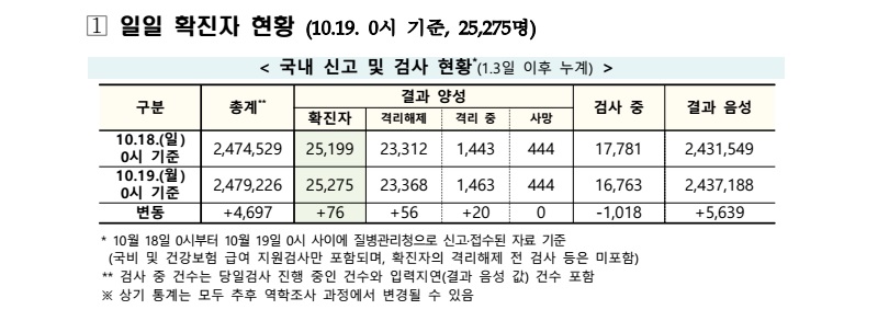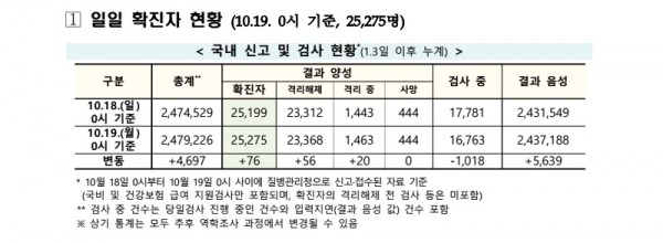 보건·의료 | 코로나19 국내 확진환자 총 25275명 및 격리해제 23368명·사망 444명, 10월 19일 0시 기준 76명 추가 확인