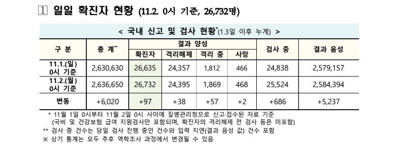 보건·의료 | 코로나19 국내 확진환자 총 26732명 및 격리해제 24395명·사망 468명, 11월 2일 0시 기준 97명 추가 확인