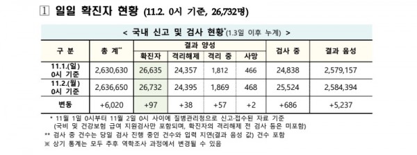 이에 따라 국내 코로나 19 확진자는 11월 2일(월) 0시 기준 26,732명으로 11월 1일(일) 0시 기준 26,635명에서 97명이 증가했으며 치료가 완료되어 검사 결과 음성으로 격리 해제된 자는 38명이 추가되며 총 24,395명, 사망은 11월 1일 대비 2명이 늘어나 468명, 나머지 1,869명은 격리 치료 중이다.