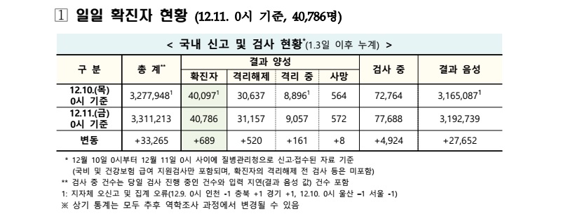 코로나바이러스감염증-19, 코로나 19, 코로나19, 신종 코로나, 신종 코로나바이러스, 감염증, 우한 폐렴, COVID-19, 보건복지부, 질병관리본부, 중앙방역대책본부, 한국, 확진자, 질병관리청, 12월 11일, 금, 금요일, 0시, 자정, 689명 추가, 대구·경북지역, 영남권, 서울, 경기, 경남, 광주, 총 40786명, 지역사회 감염, 위기경보 단계, 심각, 격상, 사망 572명, 격리 해제 31157명, WHO, 팬데믹, Pandeminc, 팬데믹 선언, 감염병 세계적 유행, 집단 감염, 사회적 거리 두기