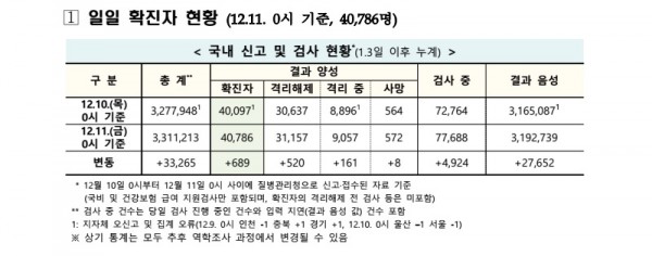 이에 따라 국내 코로나 19 확진자는 12월 11일(금) 0시 기준 40,786명으로 12월 10일(목) 0시 기준 40,097명에서 689명이 증가했으며 치료가 완료되어 검사 결과 음성으로 격리 해제된 자는 520명이 추가되며 총 31,157명, 사망은 12월 10일 대비 8명이 늘어나 572명, 나머지 9,057명은 격리 치료 중이다.