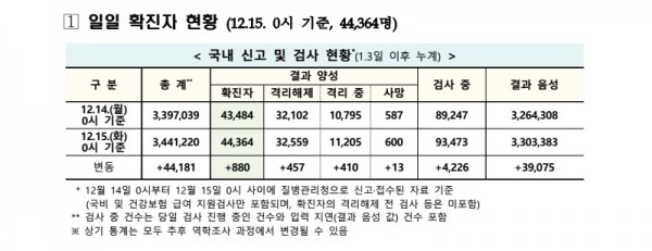이에 따라 국내 코로나 19 확진자는 12월 15일(화) 0시 기준 44,364명으로 12월 14일(월) 0시 기준 43,484명에서 880명이 증가했으며 치료가 완료되어 검사 결과 음성으로 격리 해제된 자는 457명이 추가되며 총 32,559명, 사망은 12월 14일 대비 13명이 늘어나 600명, 나머지 11,205명은 격리 치료 중이다.