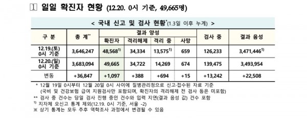 이에 따라 국내 코로나 19 확진자는 12월 20일(일) 0시 기준 49665명으로 12월 19(토) 0시 기준 48,568명에서 1097명이 증가했으며 치료가 완료되어 검사 결과 음성으로 격리 해제된 자는 388명이 추가되며 총 34,722명, 사망은 12월 19일 대비 15명이 늘어나 674명, 나머지 14,269명은 격리 치료 중이다.