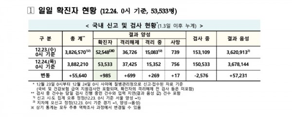 이에 따라 국내 코로나 19 확진자는 12월 24일(목) 0시 기준 53,533명으로 12월 23(수) 0시 기준 52,548명에서 985명이 증가했으며 치료가 완료되어 검사 결과 음성으로 격리 해제된 자는 699명이 추가되며 총 37,425명, 사망은 12월 23일 대비 17명이 늘어나 756명, 나머지 15,352명은 격리 치료 중이다.