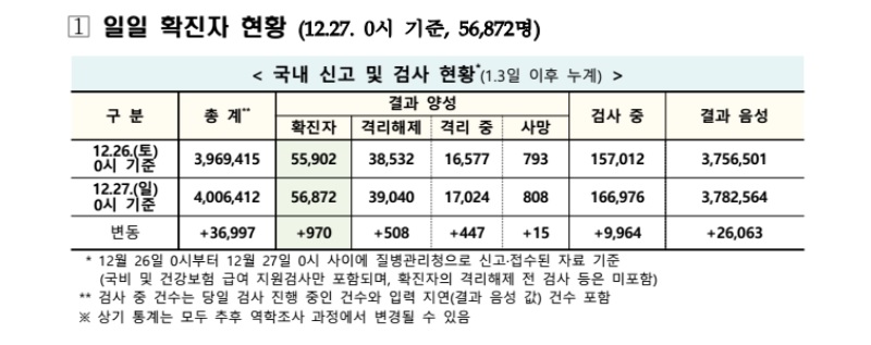 보건·의료 | 코로나19 국내 확진환자 총 56872명 및 격리해제 39040명·사망 808명, 12월 27일 0시 기준 970명 추가 확인