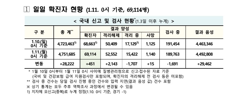 보건·의료 | 코로나19 국내 확진환자 총 69114명 및 격리해제 52552명·사망 1140명, 1월 11일 0시 기준 451명 추가 확인