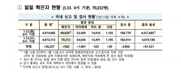 보건·의료 | 코로나19 국내 확진환자 총 70212명 및 격리해제 54636명·사망 1185명, 1월 13일 0시 기준 562명 추가 확인